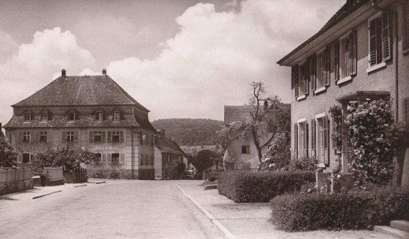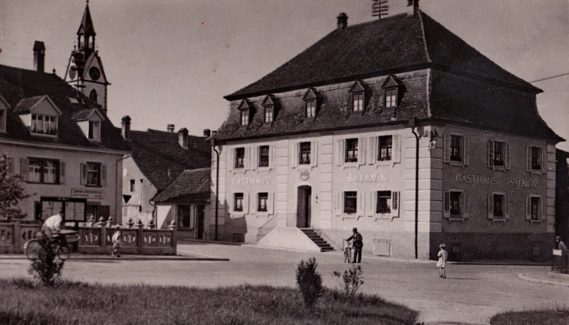 Jestetten mit Bus . Gasthaus Adler von 1817 ,1984 abgerissen